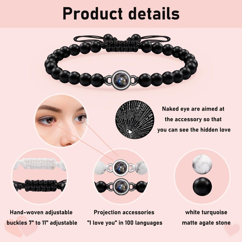 - HOW TO USE: This projection bracelet adopts nano micro-engraving technology. Engrave "I love you" in 100 different languages on the love stone, express love and sincerity, and surprise your lover. You can see the hidden "I love you" by holding the projection stone close to your eyes or using the camera.
