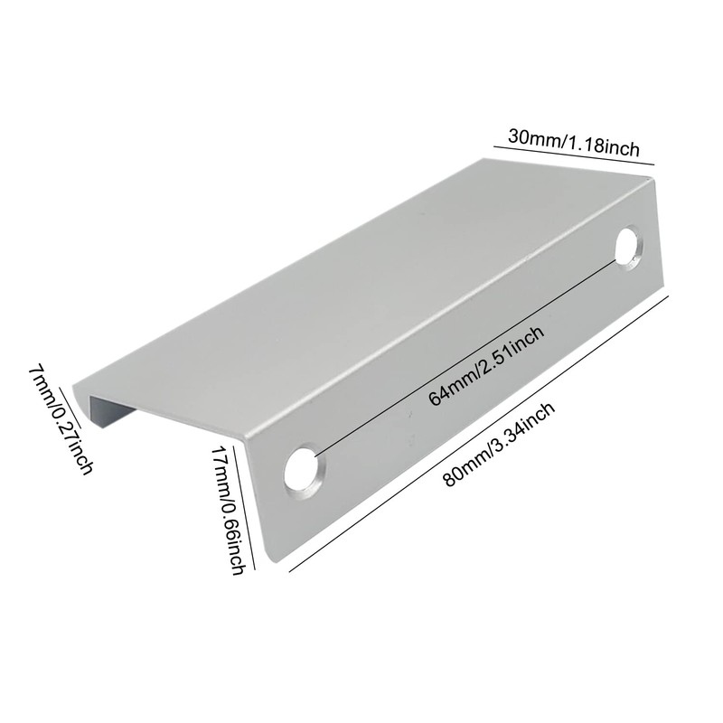 - CONCEALED HANDLES - Package contains 2 x concealed drawer handles with mounting screws. Color: Silver. Overall Length: 80mm / 3.15". Width: 30mm / 1.12". Center to Center: 64mm / 2.52".
