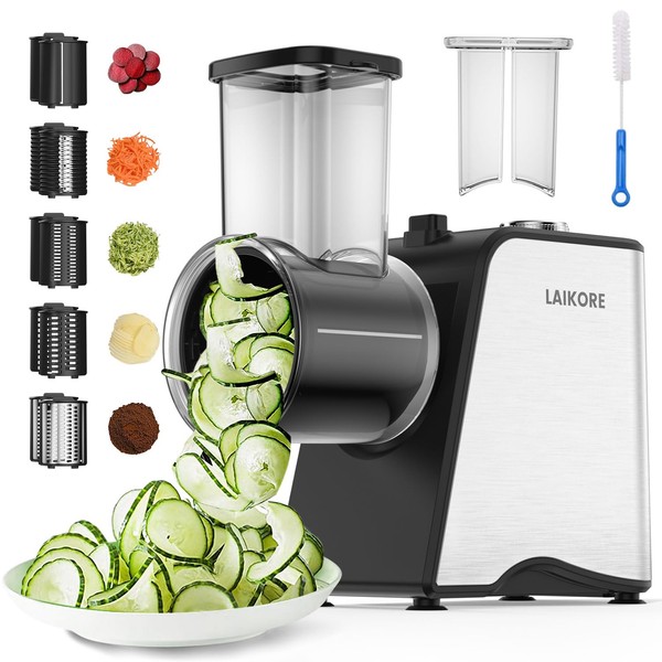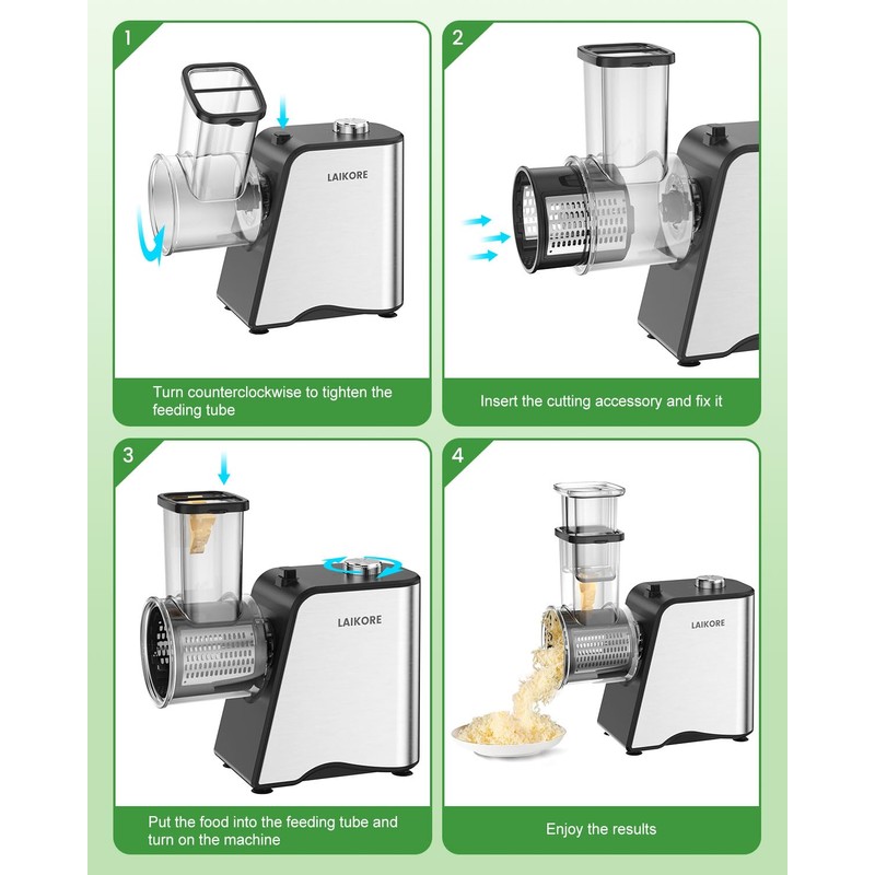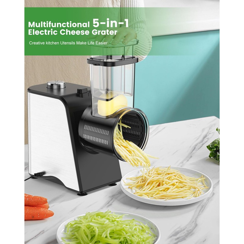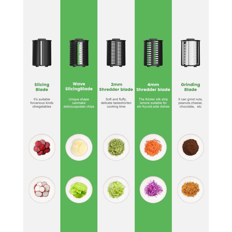 • 5 Interchangeable Stainless Steel Blades: This cheese shredder electric includes coarse shredding, fine shredding, slicing, wavy slicing, and grinding blades. Durable and versatile, it meets all your kitchen prep requirements, from salads to desserts
