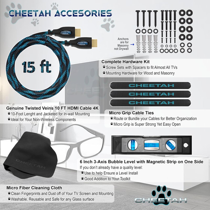 - Easy Installation with In Pole Cable Management, a Full Hardware Kit, a 6" 3-axis Magnetic Level, Screws+Spacers for All TV Brands, and a Microfiber Cleaning Cloth for Display Install Fingerprints