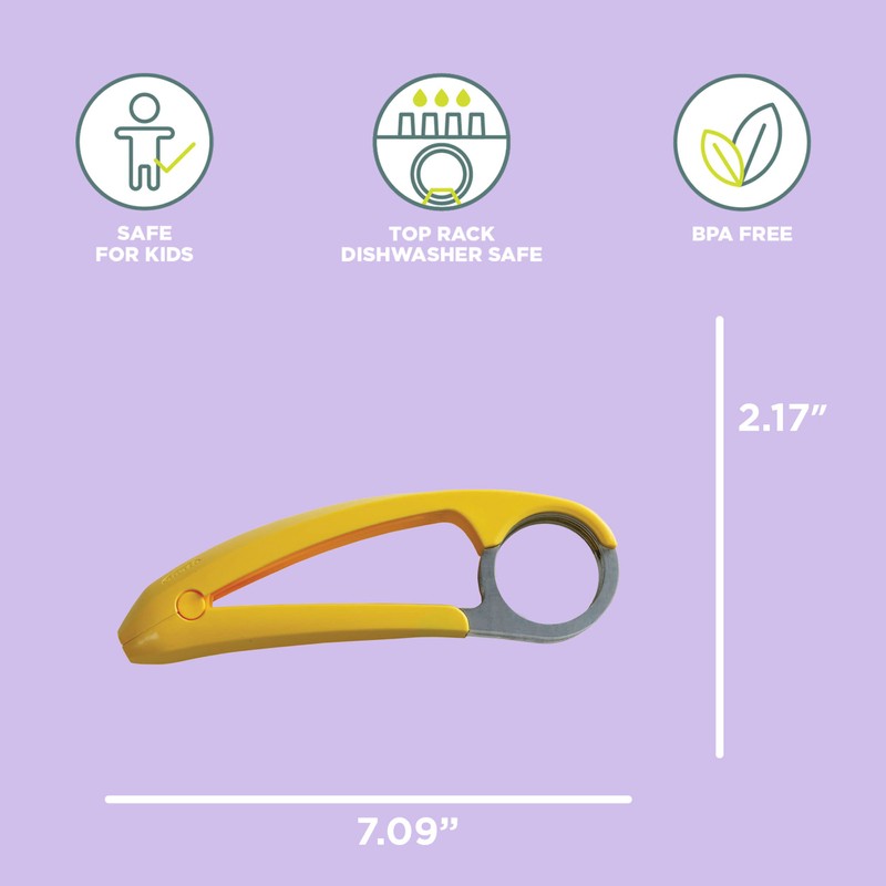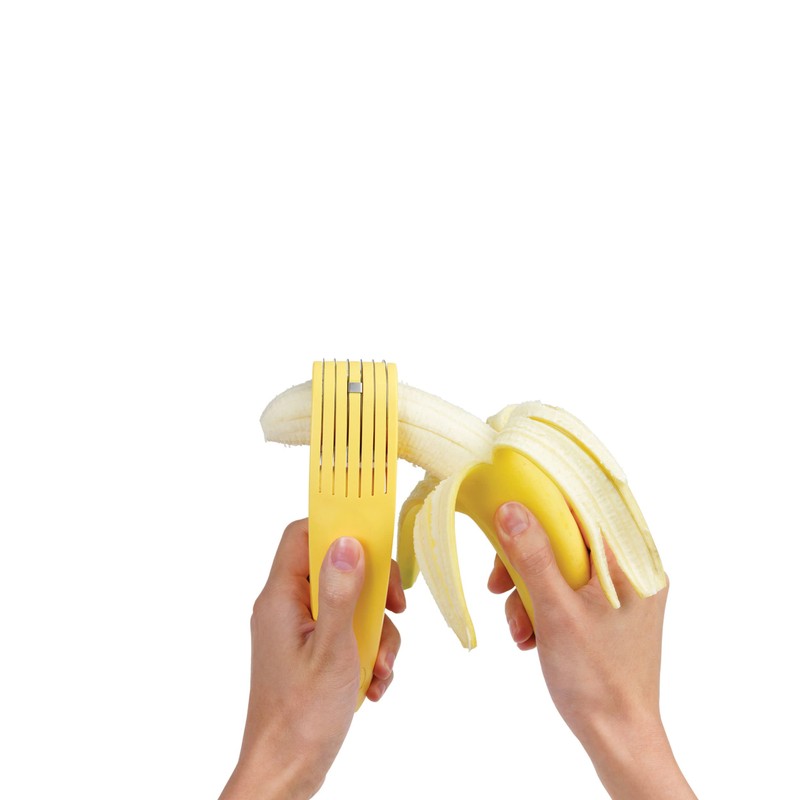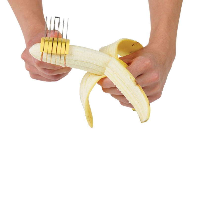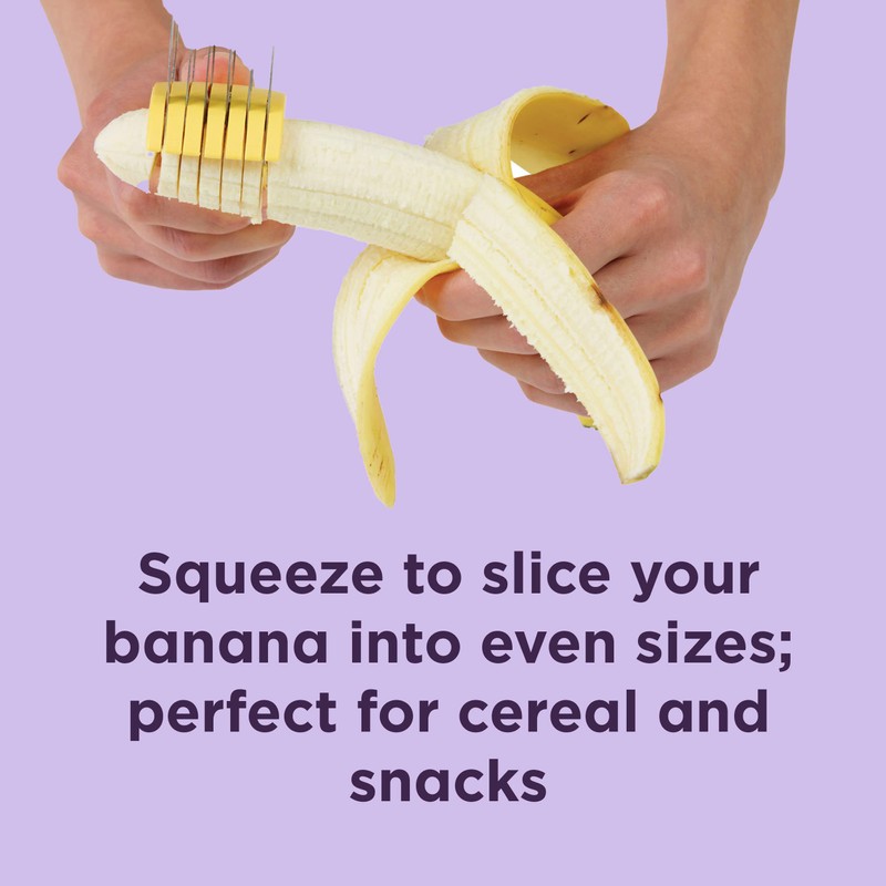 - Corta perfectamente plátanos enteros en segundos con esta valiosa herramienta de cocina. Para usar, simplemente sostén sobre un tazón o plato y aprieta el mango para docenas de rodajas de plátano uniformes.