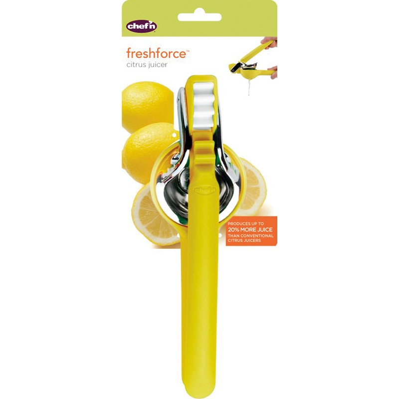Margarita and lemonade lovers rejoice! Squeeze yourself some fresh citrus with the Chef's Fresh Force citrus juicer. This brightly colored handheld citrus juicer produces up to 20 percent more juice than conventional juicers thanks to an innovative dual-gear mechanism that increases pressing power and reduces hand fatigue. Durable nylon and stainless steel construction ensures a long lifetime of use. Great for squeezing lemons, This kitchen and bar tool also works well with limes and other small citrus fruits. Top rack dishwasher safe. Choose smart, easy-to-use kitchen utensils that are built on tasteful design, new technologies, and the trusted reputation of Chef's.