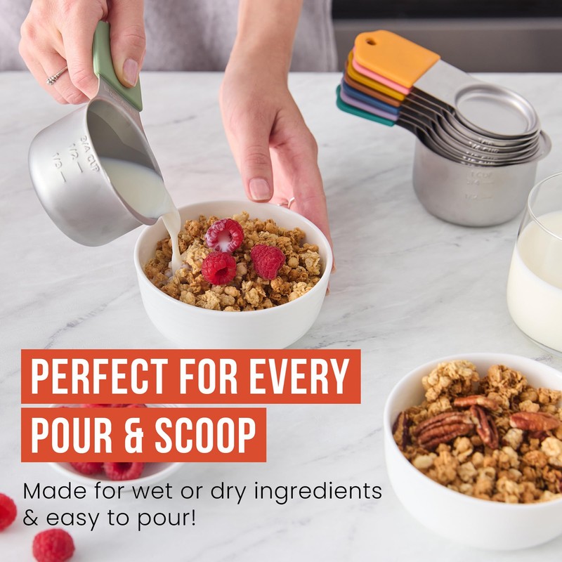 - EASY-TO-READ AND COLOR-CODED HANDLES: These stackable measuring cups feature clear, etched measurements that won’t fade. The colorful, silicone-wrapped handles provide a comfortable, non-slip grip and include built-in magnets for secure nesting and easy identification.