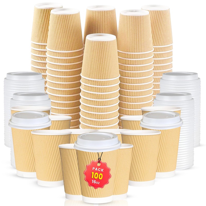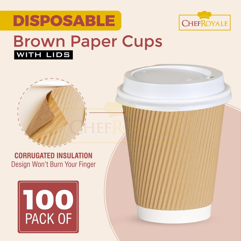 CHEF ROYALE 100x 16oz Disposable Kraft Ripple Paper Hot Coffee Cups with Lids - Paper Cups for Hot and Cold Drinks - Insulated Takeaway Coffee Cups for Eco-Friendly Hot Cups Birthday Party(100, 16oz)