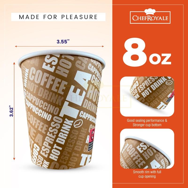 - Hassle-Free Convenience: Say goodbye to washing dishes and hello to hassle-free enjoyment! With Chef Royale's Brown Printed Paper Cups, you can indulge in your favorite drinks without worrying about cleanup. Simply sip, savor, and dispose, saving time and effort while still relishing your beverage moments.
