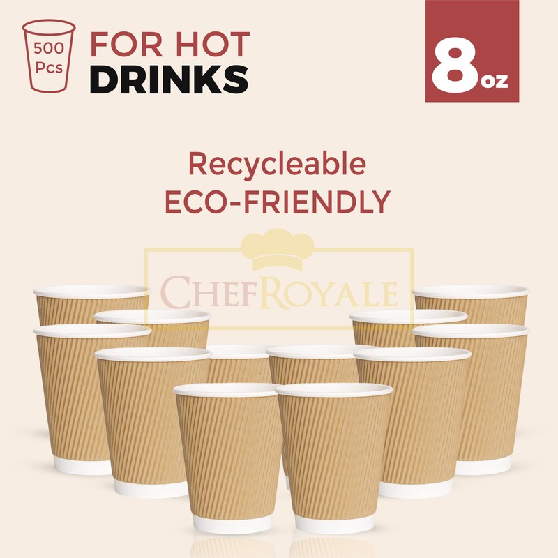 CHEF ROYALE 500x 8oz Disposable Kraft Paper Hot Coffee Cups - Paper Cups for Hot and Cold Drinks - Insulated Takeaway Coffee Cups for Eco-Friendly Hot Cups Wedding Birthday Party (500, 8oz)
