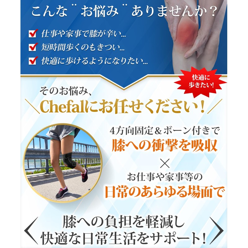 - 【衝撃を吸収し膝への負担を軽減!】スポーツやお仕事、運転や家事など、日常の様々な場面で膝をしっかり固定したい場面はございませんか? そんなあなたにお勧めなのが膝をガッチリ固定できるChefal膝サポーターです。膝関節全体をガッチリ支える4方向ベルトでガッチリ固定し 膝 サポーター 装着により膝への負担を軽減します。