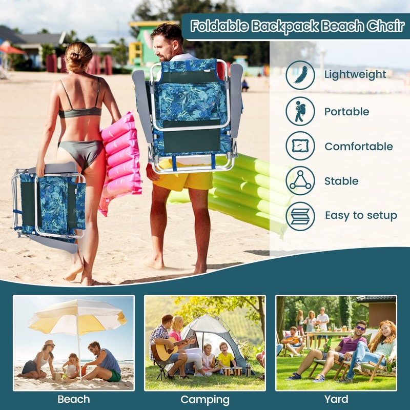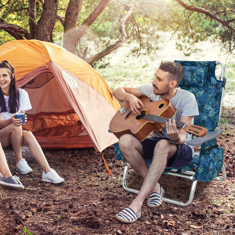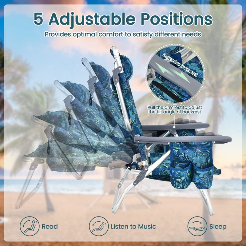 CHEFJOY Backpack Beach Chair, 5 Position Adjustable Camping Chairs with Head Pillow, Cooler Bag, Towel Bar, Cup Holders, Portable 2-Pack Folding Beach Chairs for Adults (Without Table, Blue Leaves)