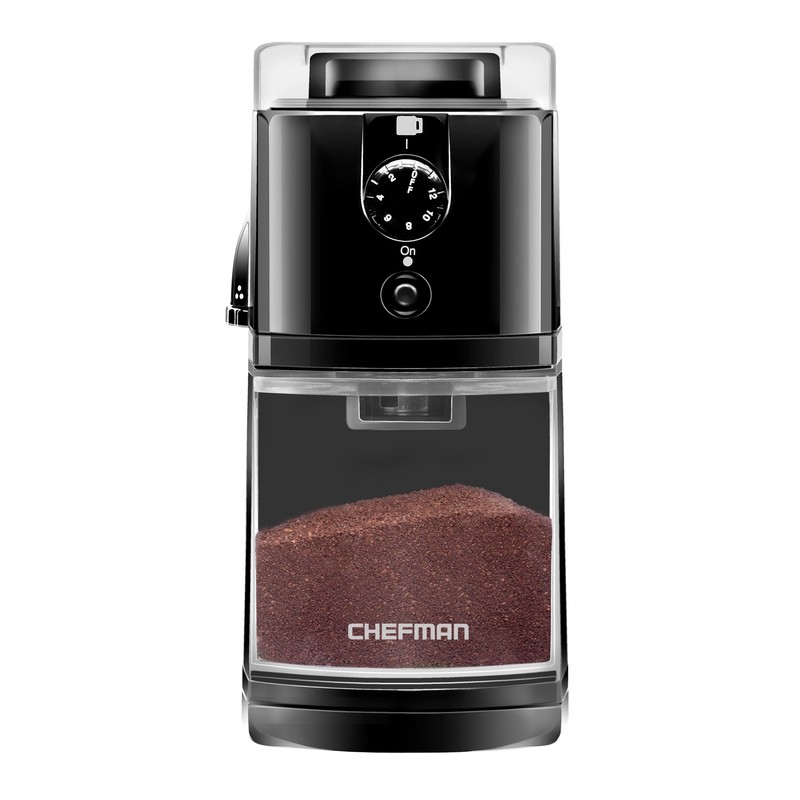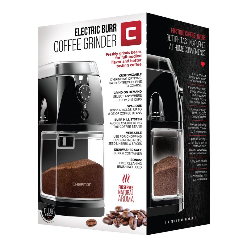 Chefman Coffee Grinder Electric Burr Mill - Freshly Grinds Up to 2.8oz Beans, Large Hopper with 17 Grinding Options for 2-12 Cups, Easy One Touch Operation, Cleaning Brush Included, Black