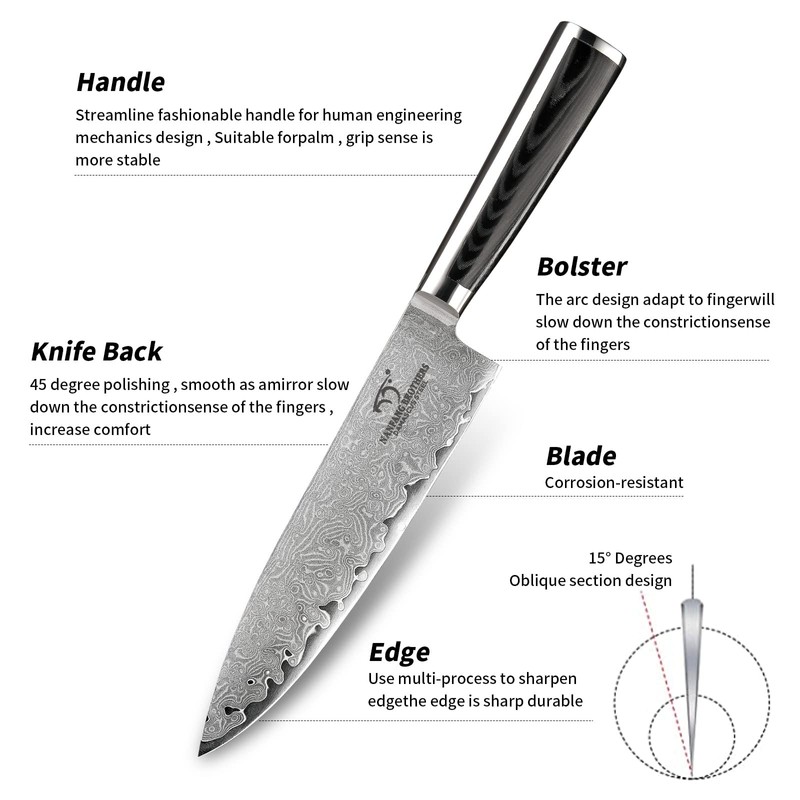 - 【67 LAYERS SUPERIOR DAMASCUS STEEL】— Professional fine tempering process on Damascus VG10 stainless steel achieves optimal clarity and long-lasting blade retention. The sharp knives provide excellent cutting performance, And the blade features with unique Damascus pattern, which makes it an attractive appearance.