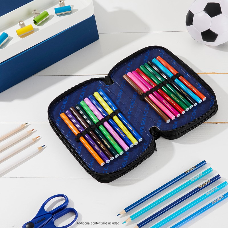 - Chelsea Filled Pencil Case - Add some football spirit to their school days with this Chelsea boys pencil case, filled with cool stationery. With 3 zipped compartments, it's jam-packed with everything your football fan could need for school, homework or doodling