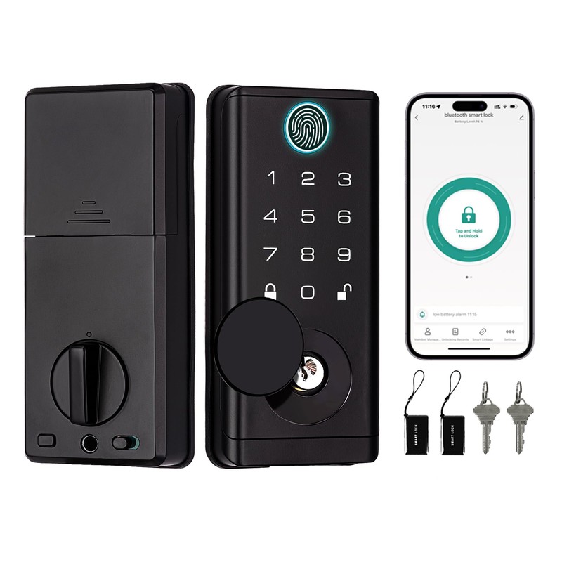 - Privacy & Convenience: Featuring auto-lock, one-touch locking, and anti-peep code functions, this fingerprint door lock provides robust protection against unauthorized access. With a 50-group fingerprint capacity, 50-group passcodes, Bluetooth APP control, IC card compatibility, and backup keys, it offers comprehensive security solutions.