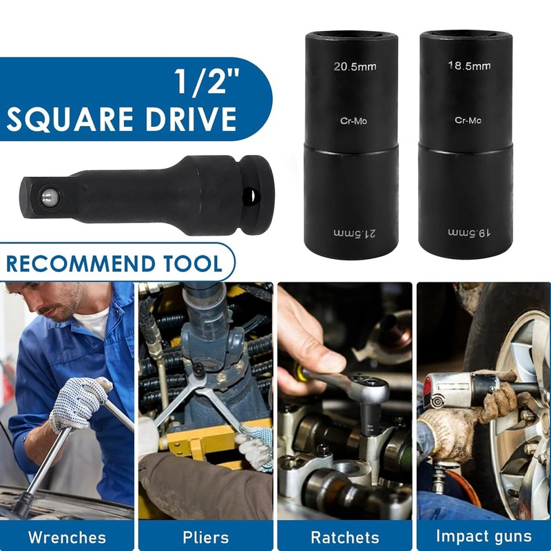 - 【Doppelseitiger Schraubenschlüssel】 Radmuttern Nuss Werkzeug 1/2", geeignet für 18,5 mm, 19,5 mm, 20,5 mm und 21,5 mm Befestigungselemente. Die Schlagnuss ist doppelseitig, sodass ein einfacher Wechsel zwischen verschiedenen Größen möglich ist. Durch die lasergravierten Abmessungen können Sie die Steckdose leicht identifizieren.