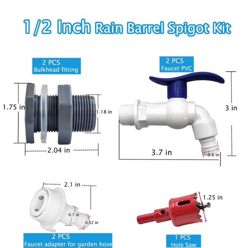 - Strong and Durable: Rain barrel spigot kit is made of PVC, Water tank connector size: Thread female 1/2'', locking nut is reversed threaded. durable PVC for long-time use