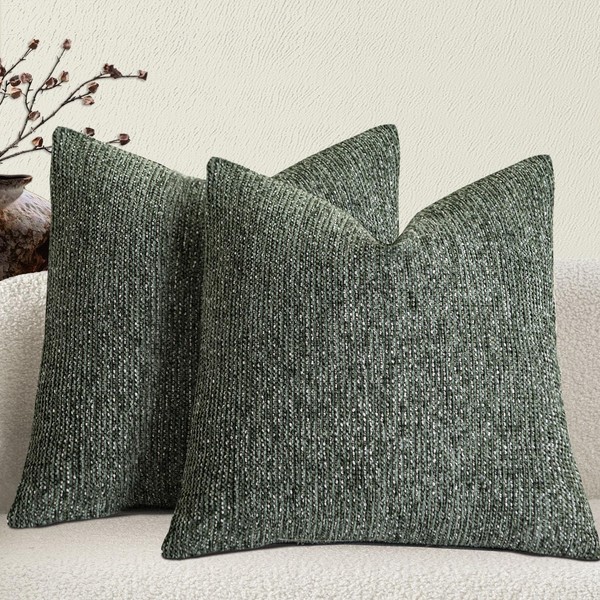 Chenille Couch Decorative Throw Pillow Covers 20 x 20 in Set of 2 - Fabric Textured Retro Farmhouse Neutral Style Soft Cushion Case Square Pillowcase for Sofa, Armchair, Living Room, Olive Green