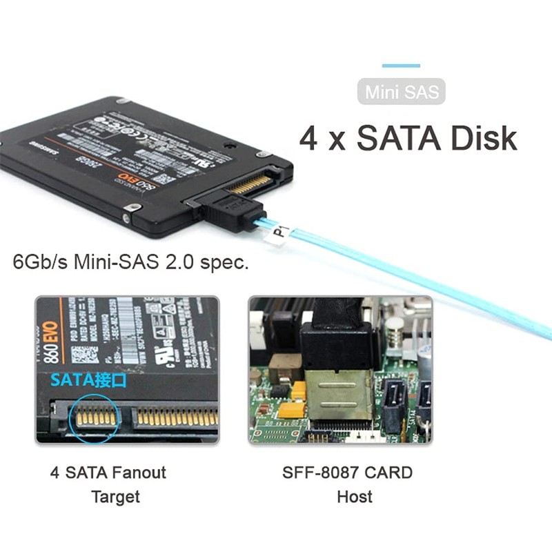 - Internal Mini SAS SFF-8087 Host to 4 SATA 7pin Target Hard Disk 6Gbps Data Server Raid Cable.