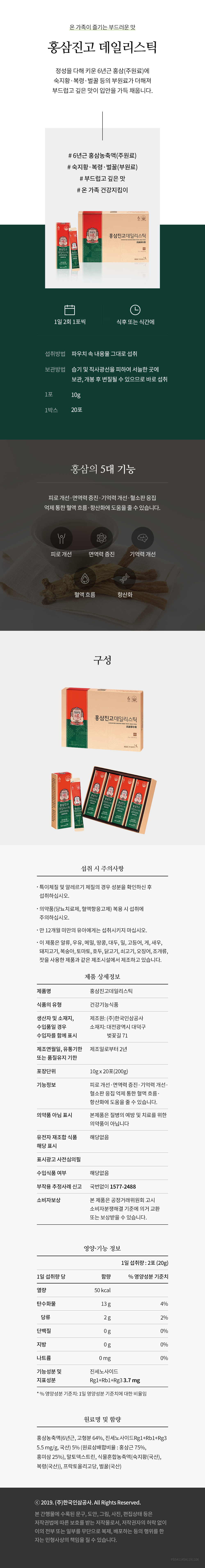 - Precautions for consumer safety: [Intake] * Directly consume 1 packet (10g) of CheongKwanJang Red Ginseng Jingo Daily Stick twice a day. [Precautions when taking] - If you have an unusual or allergic constitution, check the ingredients before consuming. - Be careful when taking medicine (diabetes medication, blood anticoagulant). - Do not give to infants under 12 months of age. - When opening the pouch, be careful and open it slowly as the contents may splash - The edges of the pouch are sharp, so be careful not to cut your skin when consuming or carrying around. [Storage precautions] Please store in a cool place, avoiding direct sunlight.