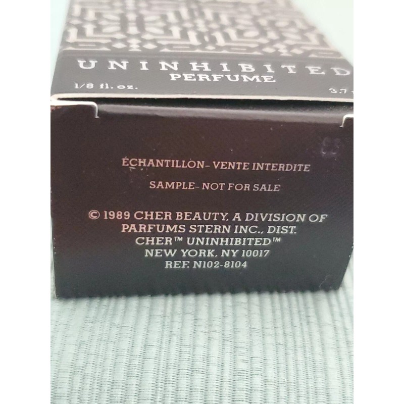 CHER UNINHIBITED PURE PERFUME SPLASHThe long discontinued Cher Uninhibited perfume classic. 3.7 ml mini perfume (not eau de toilette) Uninhibited by Cher is a Floral Aldehyde fragrance for women. Uninhibited was launched in 1987. The nose behind this fragrance is Francis Bocris. Top notes are Aldehydes, Bergamot and Orange; middle notes are Ylang-Ylang, Heliotrope, Tobacco, Geranium, Rose and Jasmine; base notes are Vanille, Sandalwood, vetyver and Virginia Cedar. ***The Cher Uninhibited line was created in 1987. This product is vintage. The container has not been opened, so I do not know how the product smells*** Price reflects the age of the product.