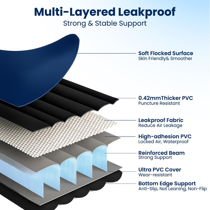 - Multi-Layer Leakproof Protection: Queen air mattress with pump is crafted with multi-layered 0.4mm thickened PVC that resists punctures, air leaks, and softening caused by PVC expansion. Reinforced seams and stable air chambers ensure every inch stays fully inflated, making queen airbed durable enough for frequent use and versatile setups