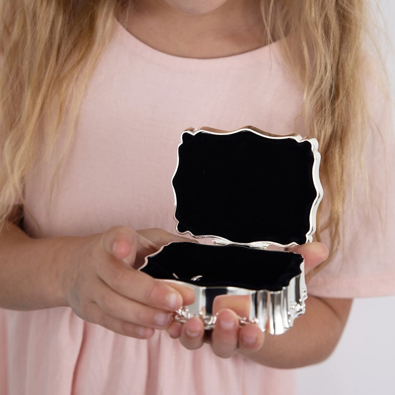 - PREMIUM QUALITY - Keep her beautiful jewelry safe and organized in this classic dainty rectangle silver-toned jewelry box. This special box measures 3"W x 2.5"H x 1"D.