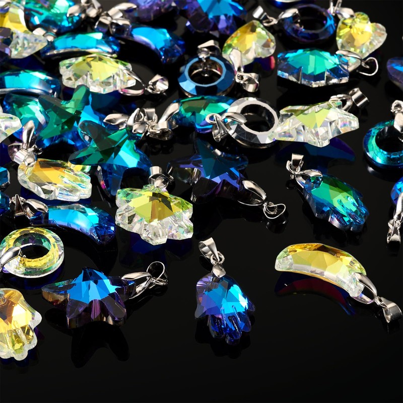 Cheriswelry 36pcs Crystal Glass Pendants Starfish Donut Moon Hamsa Hand Snowflake Heart Dangle Charms Hang Ornament with Pinch Bails 18~25mm for DIY Keychain Necklace Jewelry Making