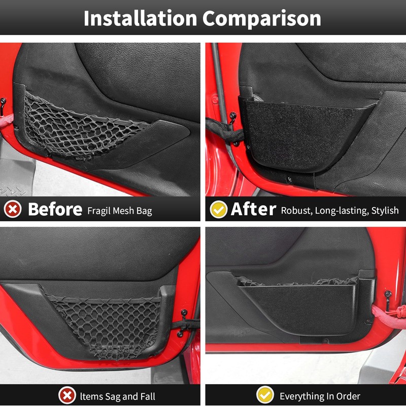 - Precise Compatibility: Door storage pockets specifically engineered for 2011 2012 2013 2014 2015 2016 2017 2018 Jeep Wrangler JK JKU 2-door and 4-door models, ensuring a comfortable and perfect fit.