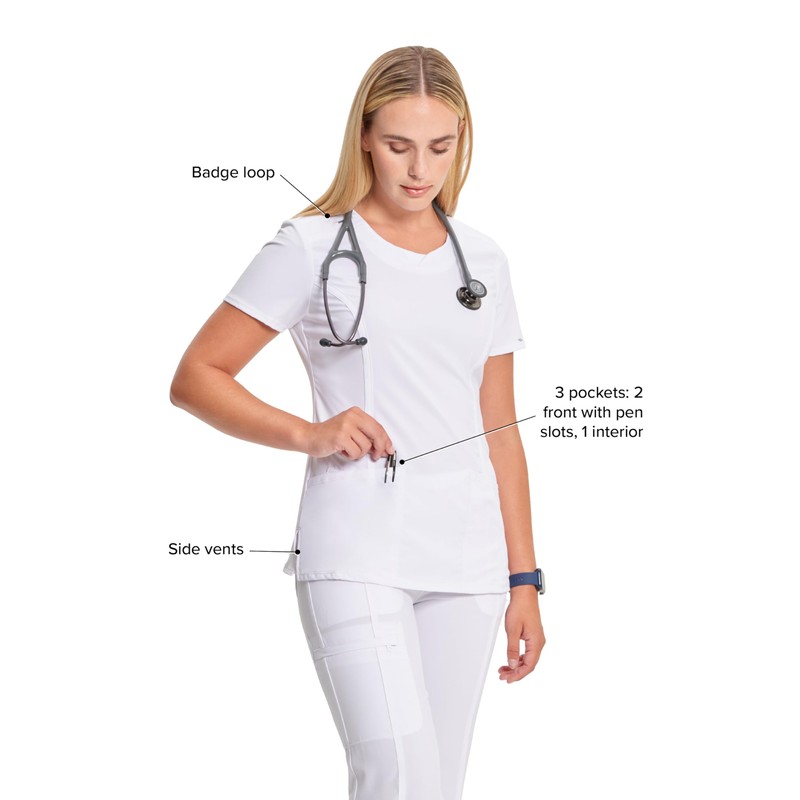 - FLATTERING FIT WITH STRETCH COMFORT - Designed with front and back princess seams and a rib-knit back panel, this contemporary fit scrub top provides a flattering shape while allowing flexibility and ease of movement for all-day comfort.