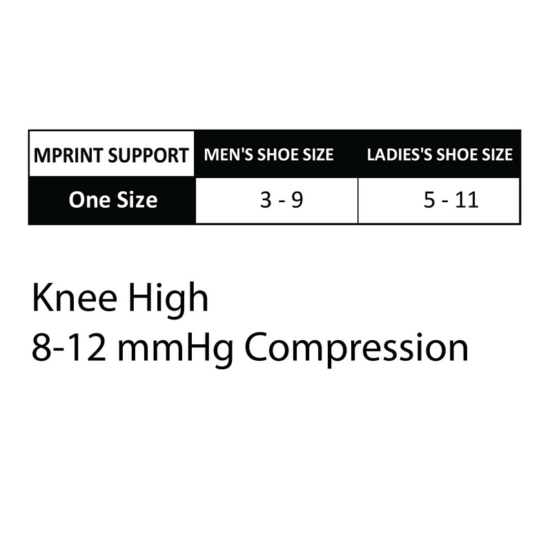 • The MPrint Support’s mild compression (8-12 mmHg) is the perfect choice for those who stand or sit all day, travel on airplanes or in vehicles, exercise, or anyone who experiences heavy, achy, or restless legs.