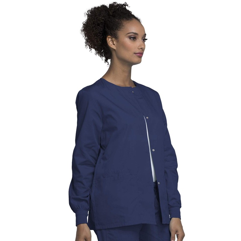 - SNAP FRONT CLOSURE - Workwear scrubs jackets for women feature a front closure with four tonal colored snaps for a professional look. This style also includes a round neck, tonal knit cuffs, and a trio of pockets. Knit cuffs stay in place when sleeves are pushed up.