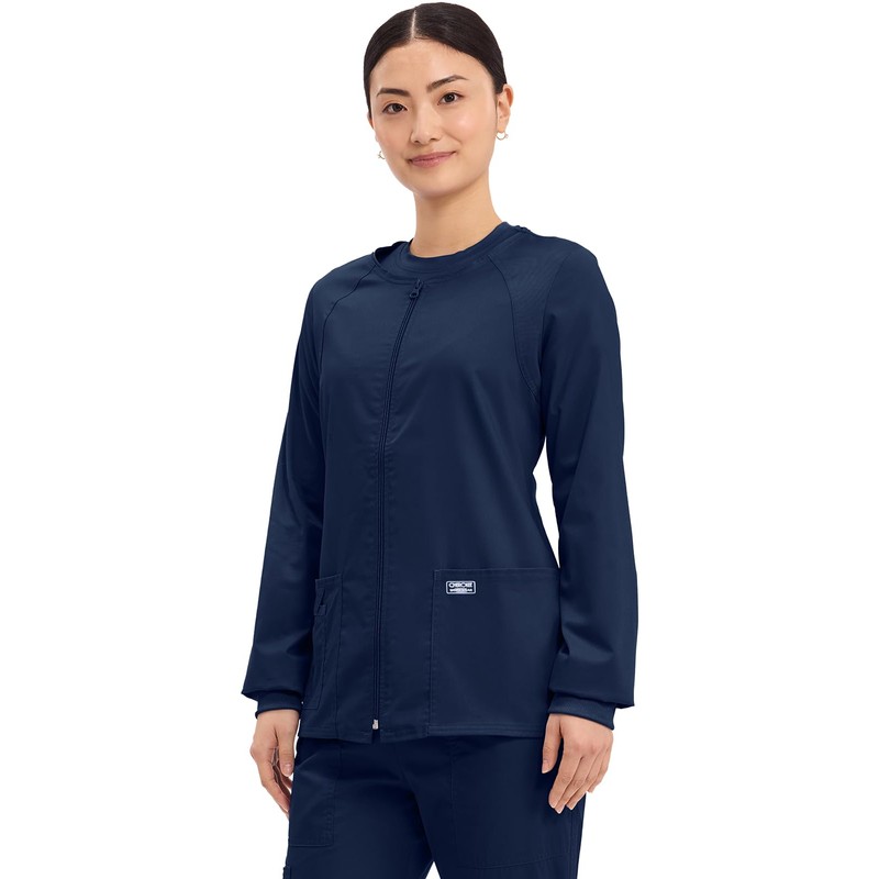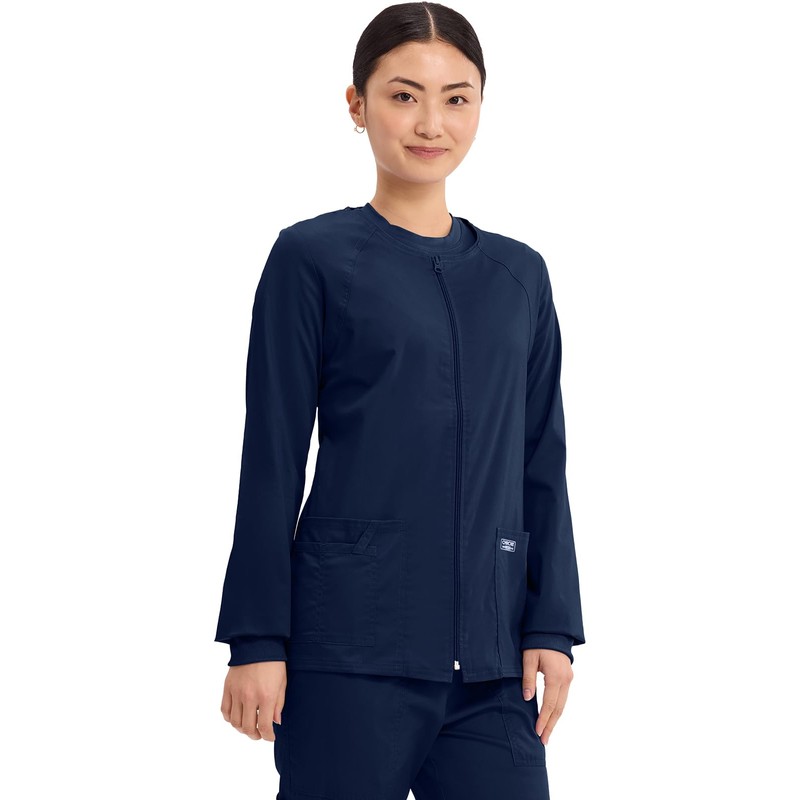 - MODERN CLASSIC FIT, SIZES UP TO 5XL - Cherokee Workwear Core Stretch womens jackets have the sizes you want and the features you need. Available in sizes from XXS to 5XL. This zip front nurse jacket includes three pockets for storage and tonal knit cuffs.