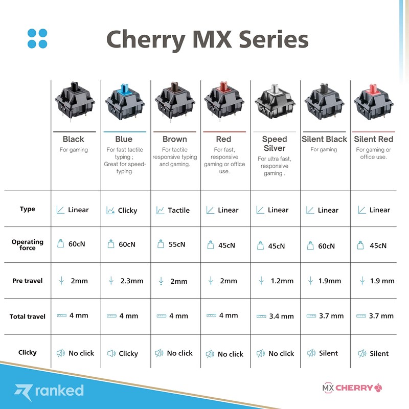 • Blue – Clicky | 2.2mm Pre-Travel | 4mm Total Travel | 60cN Actuation