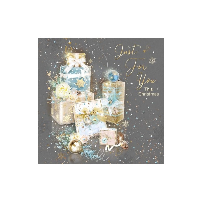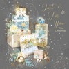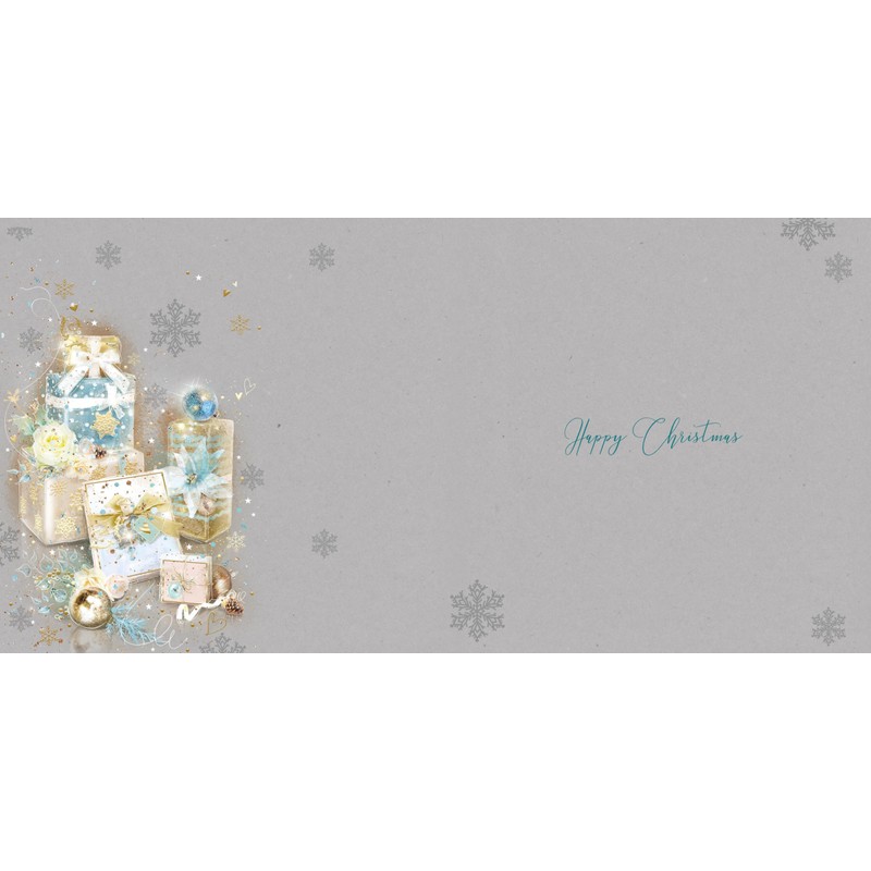 Cherry Orchard Open Happy Christmas Card, Artistic Presents and Bows Design from the Gorgeous Grace range, finished with gold foil, comes with Gold Envelope
