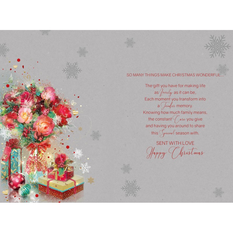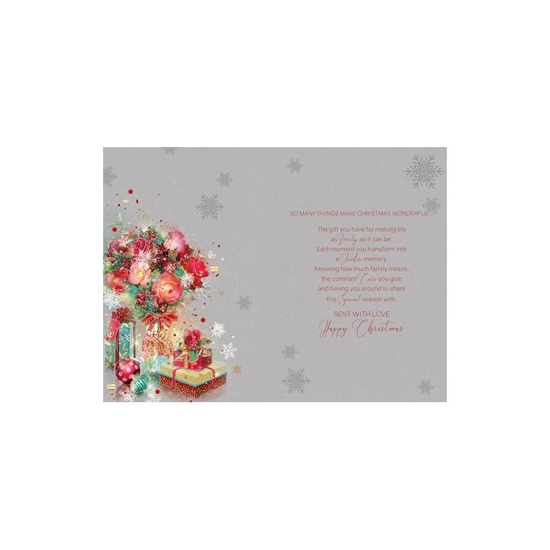 - Inside Message reads: ' SO MANY THINGS MAKE CHRISTMAS WONDERFUL ... The gift you have for making life as Lovely as can be, Each moment you transform into a tender memory. Knowing how much family means, the constant care you give and having you around to share this special season with. SENT WITH LOVE ,Happy Christmas'.