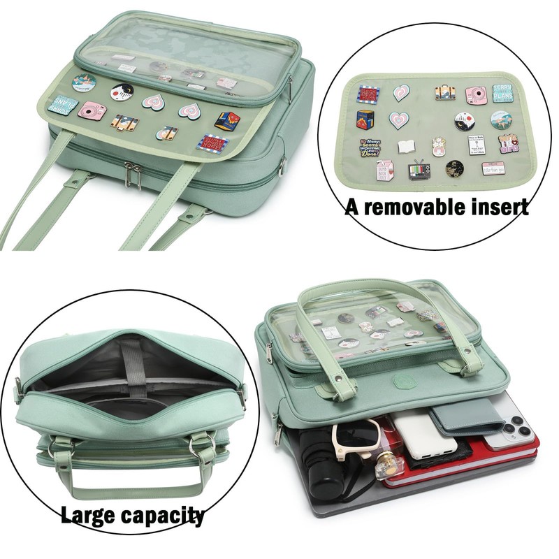 - Structure This bag has a large main pocket and an inner pocket. One exterior zipper pocket and one clear pocket. Comes with an ITA bag insert. The square transparent window is ideal for lapel pins, brooches, badges, buttons, stickers and small aesthetic items you don't want to lose.
