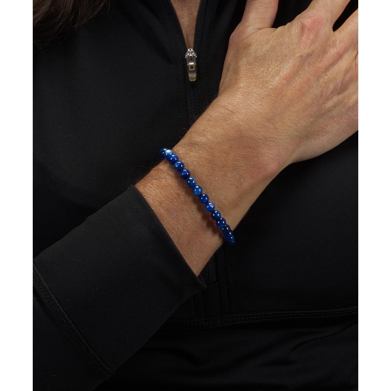 - CONTAINS: A blue kyanite bracelet made with 6mm semi-precious beads packaged inside a protective cloth drawstring pouch. Kyanite is an aluminosilicate mineral. It forms with long straight fibers which can be seen when cut into gems or beads. These beads are an amazing deep blue color. Heat stabilized to increase durability.