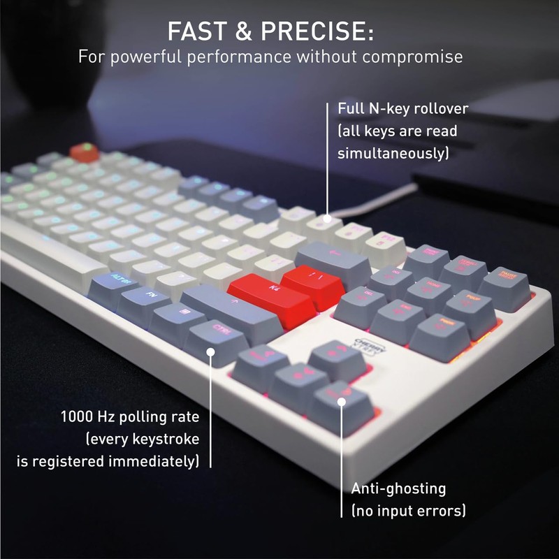 - SPLIT-SECOND REACTIONS. 1000 Hz polling rate makes for instant registration of every key- press, while full N-key rollover means zero missed keystrokes – no matter how many you press at once.