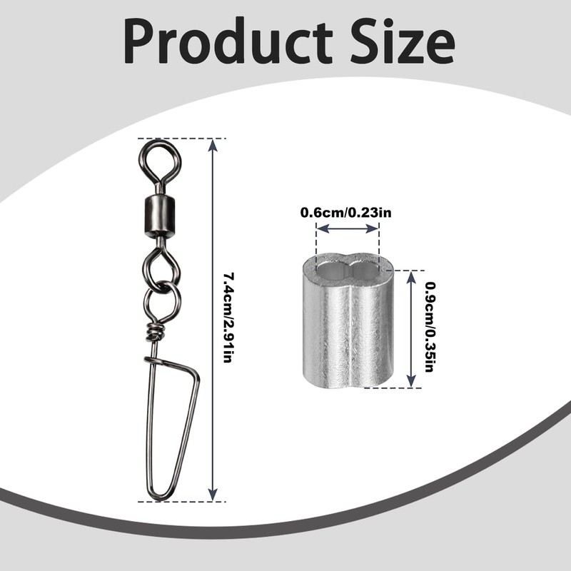 - 💜 Size Specifications: The decoy cord crimps feature holes approximately 1/8 inch (3 mm) and 1/4 inch (6 mm) in size, ideal for securing lines thinner than 1/8 inch. For optimal use, thinner lines are suggested. The fishing swivels are about 74 mm (2.91 inches) long. Ensure these dimensions suit your needs prior to purchase.