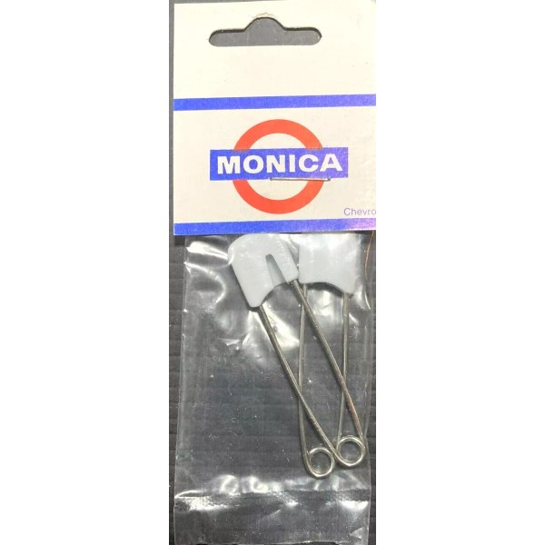 Vintage 4 3/4" tall package contains two White Diaper Pins. The header has the Chevron colors and is marked "Chevron" in the lower right corner. They are also marked "Monica". The diaper pins are marked "Japan" Original Package.