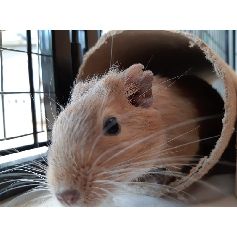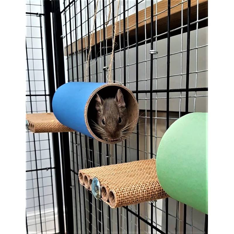 Designed specifically with degus in mind these tubes are hand-made from degu-safe materials and provide hours of fun for your inquisitive pets. Made from sturdy cardboard, they are chewable but take a long time to destroy being more durable, subjected to the frenzied degu chew. These tubes come with string pre-attached for quick and easy fitting to any cage type. The paper tube cover is made with recycled paper and a non toxic Degu safe colouring. hey come in six colours! Your furry pets will love to run, hide and sleep in these tubes which can be attached to the top or side of the cage to provide a run for your Degus and an extra level in the cage. They will brighten up your pets home and create a happy environment. Specification of tubes. Dimensions: 88mm diametre x 168mm long Your Degus will love these chewable tubes (Chewchewbs) and will love you for buying them. (Although we are degu biased they are also ideal for other small pets :- hamsters, gerbils, mice and especially rats).