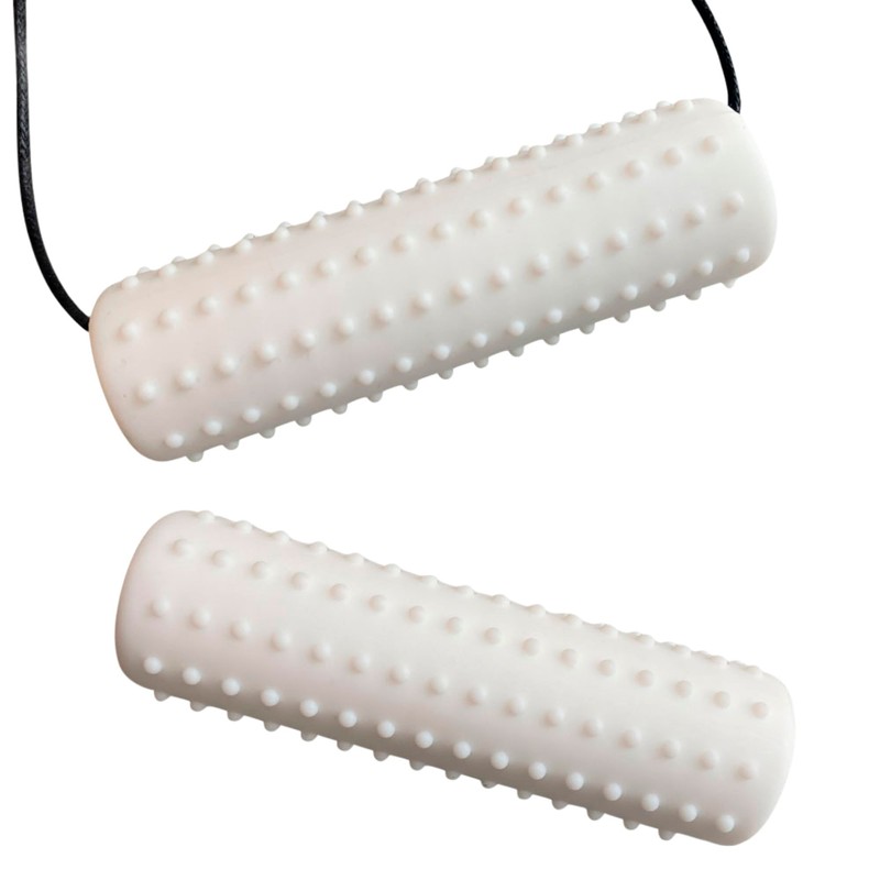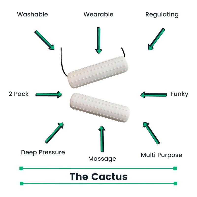 The Chewigem Cactus can be used in a variety of ways. Worn on the cord it comes with, it serves as chewellery. It can also be used as a pen or pencil topper or attached to hoodie strings. Sold in sets of two, one will arrive on a cord and the other can be kept as a spare or put to a different use.