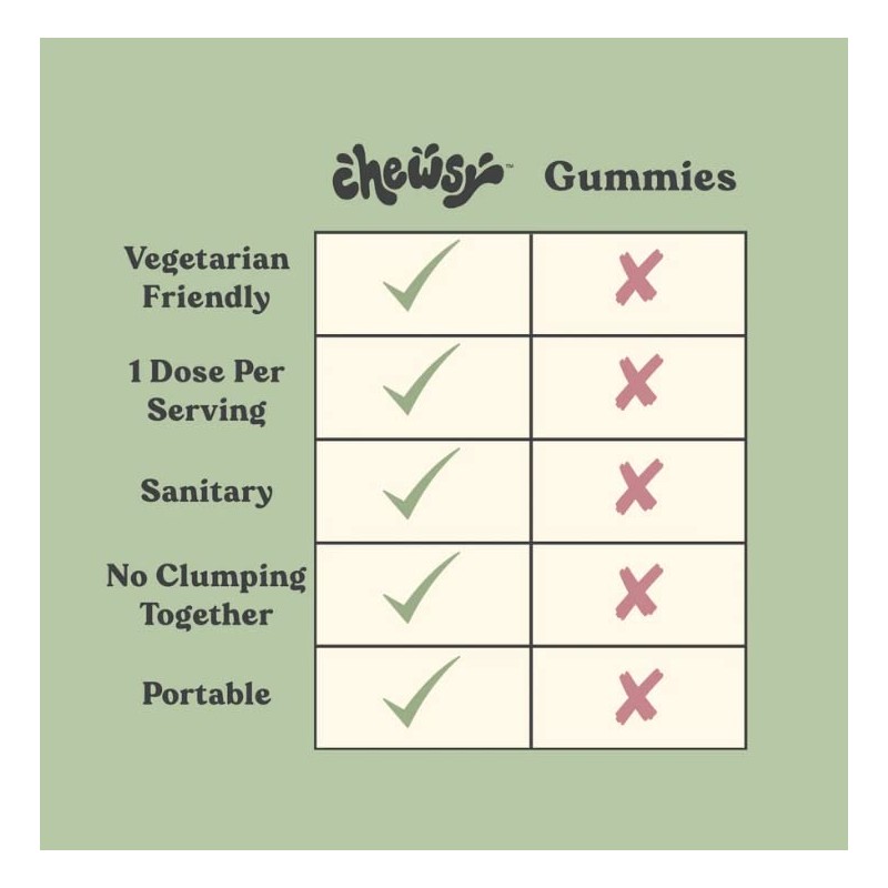 - Smart Packaging: What makes Chewsy truly amazing is the fact that every chew comes individually wrapped, which is a more hygienic and safer alternative. In comparison with traditional gummies, our chews are concentrated and deliver in one dose the equivalent of 2-6 gummies, so our 30-day supply pack is enough to help you achieve your goals.