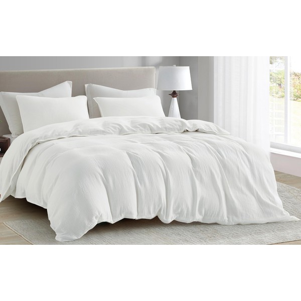 Chezmoi Collection Breeze 3-Piece Cotton Gauze King Duvet Cover Set, White Soft Washed Cotton Linen Like Textured Breathable Comforter Cover with Button Closure