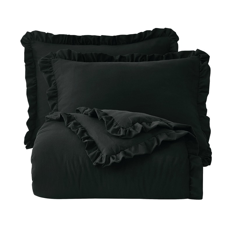 Chezmoi Collection Nora Black Comforter Set Oversized King Size 3-Piece Fluffy Soft Lightweight Bedding Ruffled Edge Trim Stone-Washed Microfiber Comforter Set for All Season