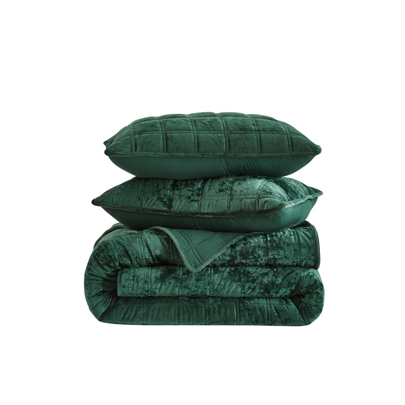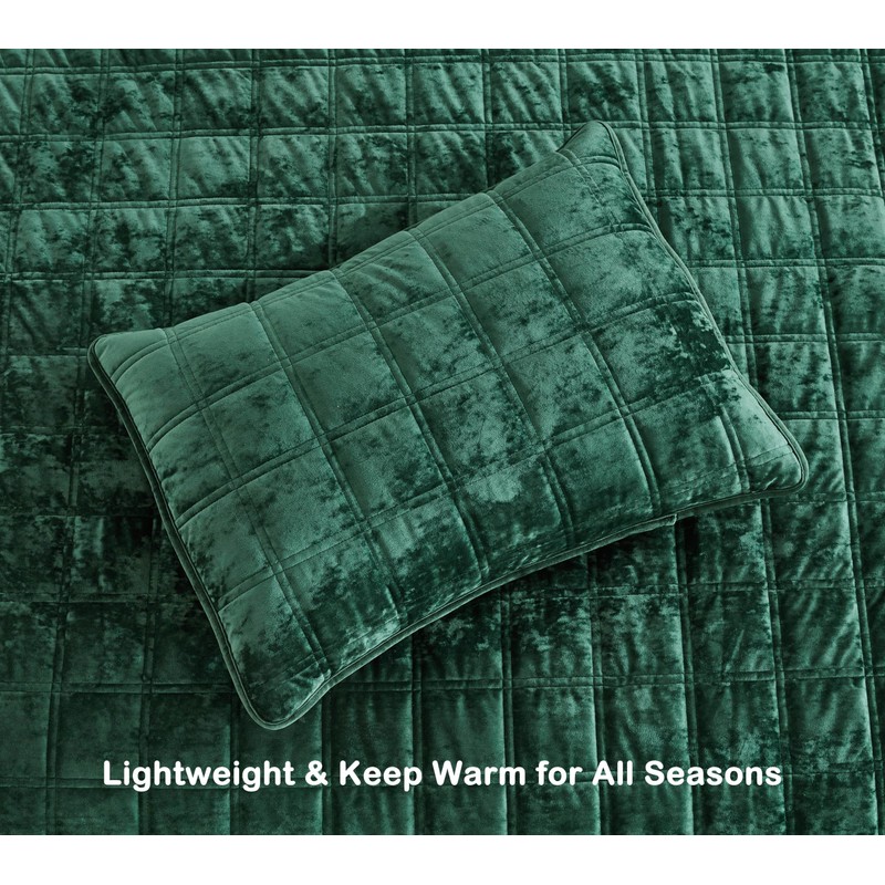 Chezmoi Collection Piers Forest Green Velvet Quilt Oversized King Set, 3-Piece Plush Distressed Velvet Bedding All Season Lightweight Comforter - Brushed Microfiber Reverse with Double Square Stitch