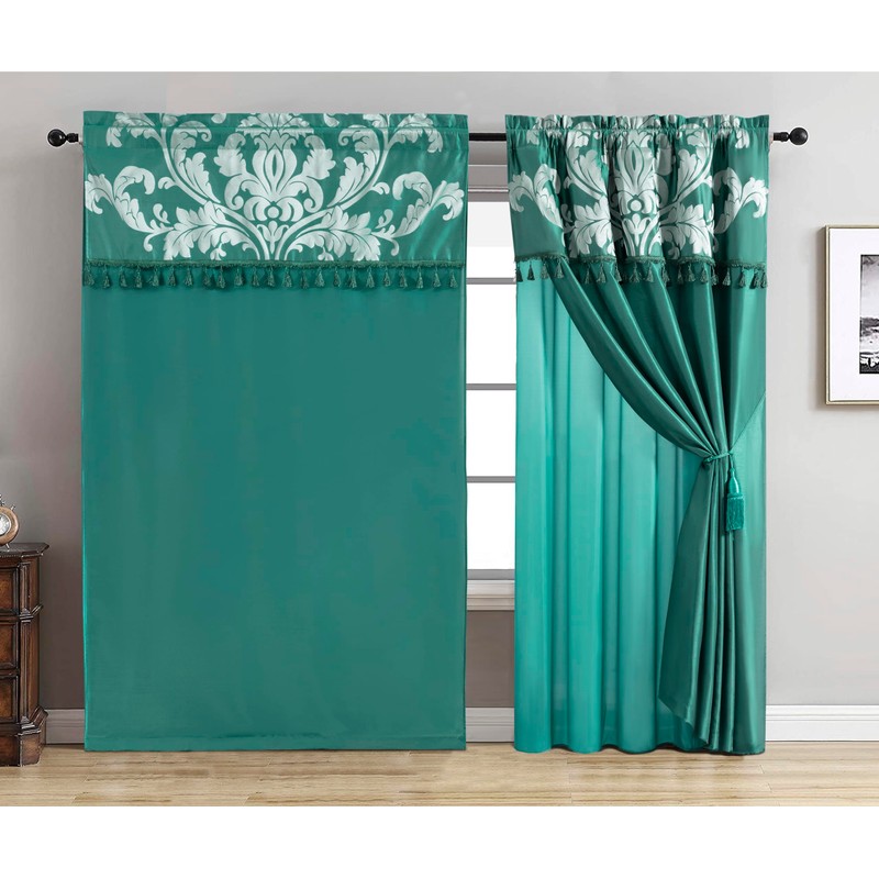 Chezmoi Collection Royale 4-Piece Jacquard Floral Window Curtain/Drape Set with Sheer Backing Valance Tassels, Green/Silver