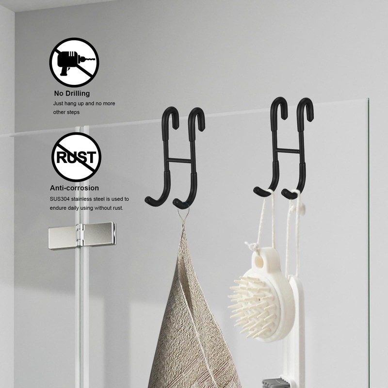 CHFILZLE No Drill Shower Hooks 2-Pack, Heavy Duty Bathroom Towel Hooks for Frameless Glass Doors, Anti-Slip Rubber Padding, Rustproof Stainless Steel Hanger for Squeegee & Robe,Black