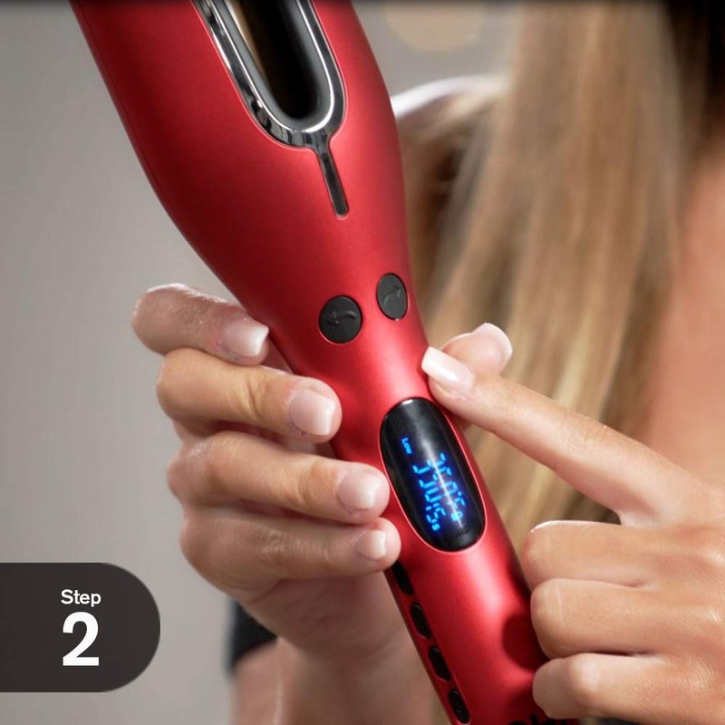 a button. Hair is drawn into the curl chamber where it is heated and timed to