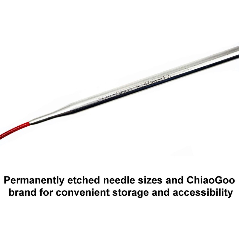 - ChiaoGoo Red Lace circulars are made of high grade stainless steel and come with a bright red, highly flexible, multi-strand, nylon-coated, steel cable allowing your yarn to easily slide end-to-end; Each item is light weight and durable, precisely machined with satin finish with perfectly tapered tips