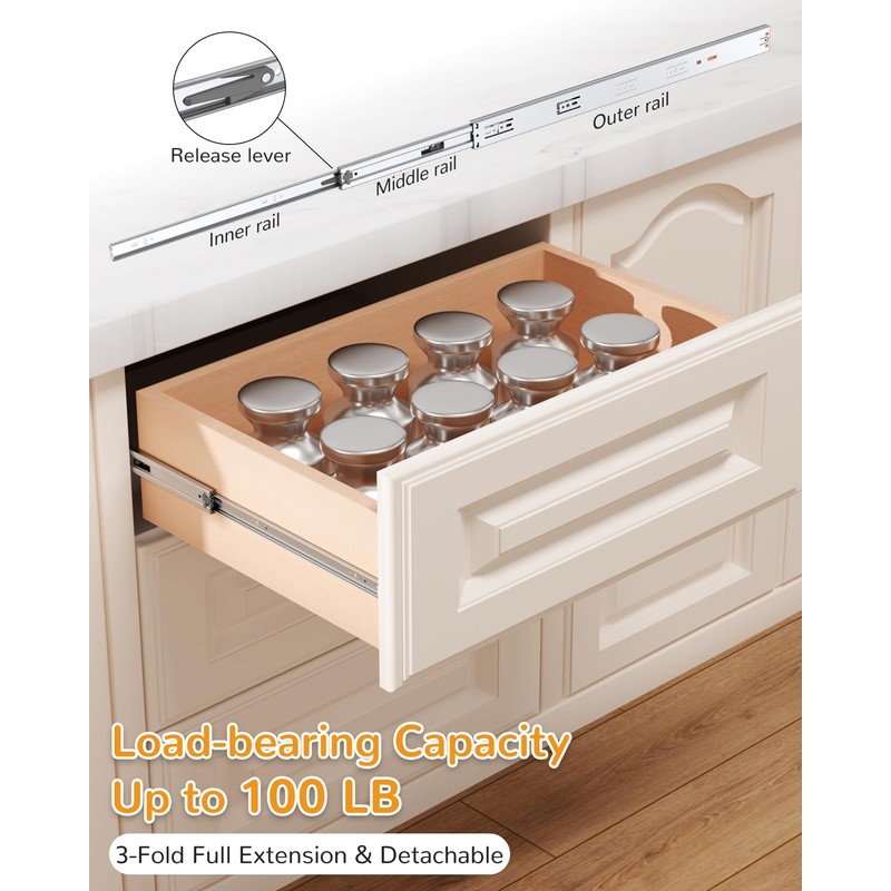 - Heavy-Duty 100lb Capacity & Solid Steel Build: Crafted from thickened 1.5mm cold-rolled steel with a nickel-plated, rust-resistant finish, these slides support up to 100 lbs without bending or warping. Rigorously tested for over 80,000 open/close cycles, delivering reliable strength, corrosion protection, and long-lasting performance you can trust