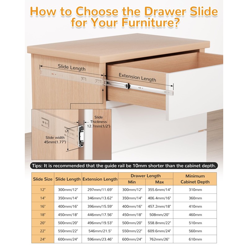 - 3-Fold Full Extension & Easy Installation: Enjoy complete access to your drawer contents with 3-fold full extension slides that open fully for maximum convenience. Easy side-mount installation makes upgrades simple. Please measure the depth of your drawer to select the correct slide length. For proper mounting, make sure there is 1/2" (12.7 mm) clearance on each side between the drawer and the cabinet opening
